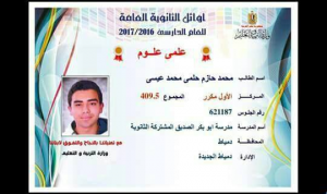 – الأول مكرر/ محمد مبروك محمد عوض سويف إدارة ابو حمص مدرسة شاكر فرج الثانوية بنين بمجموع 409.5