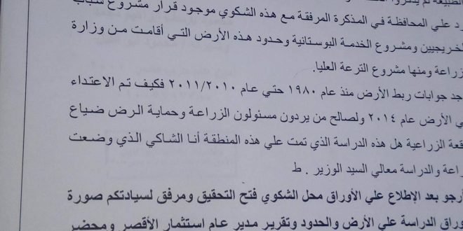 مشدد علي ان ، وزارة الزراعة قامت بربط و ضم الاراضي المستصلحة منذ عام 1980 الي حوزتها و تم صرف الاسمدة و المبيديات لها من الوزراة وبات الارض في حوزتها كما ان ري هذه الارض خاضع الي وزارة الري ، ولكن محافظ الاقصر يريد ان يحول 450 فدان من الاراضي الزراعية الي منطقة صناعية .