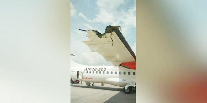 وأظهرت الصور التي تم تداولها على موقع التواصل الاجتماعي (تويتر)، تهشم جناح الطائرة التابعة لخطوط (وينجز إير).