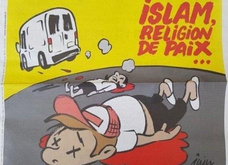 وكانت الصفحة الأولى للمجلة التي استهدفها اعتداء متطرفين في 2015، بدا في الرسم شخصان منطرحان أرضاً وسط الدماء بعدما دهستهما شاحنة صغيرة، إلى جانب عبارة “الإسلام.. دين السلام الأبدي”.
