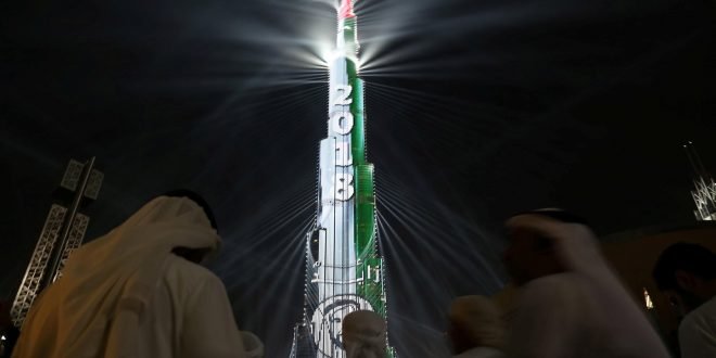 احتفلت دبي بحلول العام 2018 بعرض ضوئي مبهر في وسط الامارة على برج خليفة، أطول مبنى في العالم، بينما اضاءت الالعاب النارية مناطق اخرى في المدينة الخليجية التي تستقطب ملايين السائحين سنويا.
