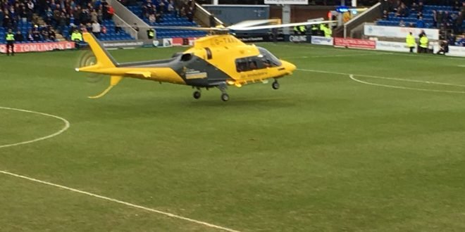 قالت صحيفة “ذا صن” إن لقاء تشيستر فيلد وضيفه لينكولن سيتى تم إيقافه فى الدقيقة 26 وإخراج لاعبى الفريقين، من أجل هبوط طائرة الإسعاف داخل الملعب لإنقاذ المشجع الذى احتاج إلى علاج سريع.