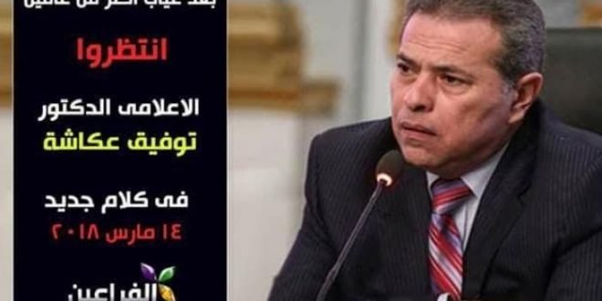 ونشر رواد موقع التواصل الاجتماعي صورة منشورة على صفحة منسوبة لقناة “الفراعين” تتضمن إعلاناً ترويجياً لعودة “عكاشة”، ومكتوباً عليها: “بعد غياب أكثر من عامين، انتظروا الإعلامي الدكتور توفيق عكاشة، في كلام جديد 14 مارس 2018”.