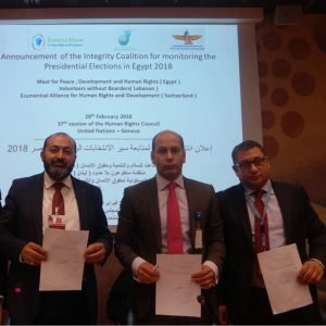 في إطار استعداداتها لمتابعة الانتخابات الرئاسية المصرية ، وبعد حصولها على موافقة الهيئة الوطنية للانتخابات ، ومن منطلق إيمانها بأهمية التكامل بين المتابعة المحلية والدولية لتقديم صورة أقرب ما تكون إلى الكمال حول تقييم العملية الانتخابية من منظور المعايير الدولية المتعارف عليها للانتخابات الحرة والنزيهة ، فقد توافقت منظمات ” متطوعون بلا حدود ” ( لبنان ) ، المنظمة المسكونية لحقوق الإنسان والتنمية بجنيف ( سويسرا) ، ومؤسسة ماعت للسلام والتنمية وحقوق الإنسان ( مصر) ، على تشكيل إئتلاف ” نزاهة ” لمتابعة الانتخابات الرئاسية المصرية 2018 والمقرر إجراء مرحلة الاقتراع للمصريين بالداخل خلال الفترة من 26 إلى 28 مارس 2018 .