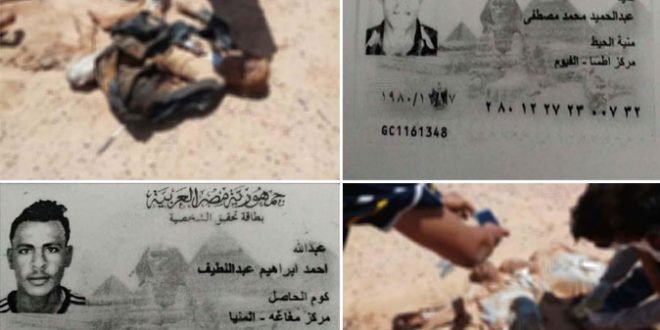 وبحسب هويات تحقيق الشخصية للمواطنين المصريين، تبين أنها تخص كل من المواطن المصرى عبدالله أحمد إبراهيم عبداللطيف، وهو من مواليد مركز مغاغة بمحافظة المنيا، والمواطن المصرى سيد عبد الحميد محمد مصطفى، المقيم فى منية الحيط بمركز إطسا التابع لمحافظة الفيوم، والمواطن المصرى حمدى رمضان عبد الحميد مرز، وهو من قرية تطون مركز إطسا الفيوم.