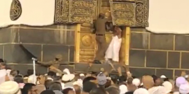 ونشر رواد مواقع التواصل الاجتماعى صورة للحادث، أظهرت رجل يرتدى زى الحج “إحرام” يقف على باب الكعبة المشرفة، ويقوم رجل أمن بإمساكه.