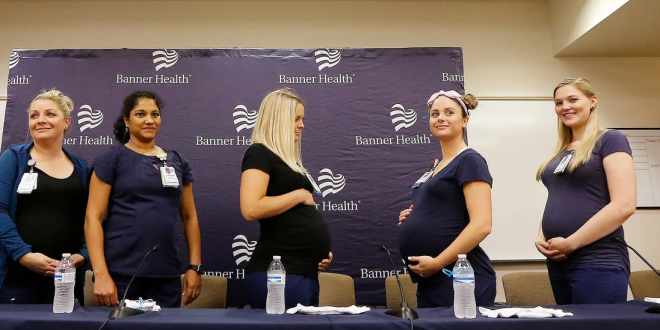 صدمت مجموعة من الممرضات فى مستشفى بولاية أريزونا عندما علمن أن 16 منهن حامل وينتظرن مولودا جديدا، وظهرت علامات الحمل على 12 ممرضة منهن بشكل واضح خلال مؤتمر صحفى عقد لهن من أجل الحديث عن تجربة الحمل معًا، وقلن إنهن سعداء بهذه التجربة التى يخضنها سويًا فى رحلتهن للأمومة، وذلك وفقًأ لما جاء فى موقع “people”.