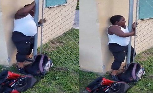 ونشر المقطع الطفل وهو يحاول الهروب من فتحة في سور المدرسة ” السلكي ” إلا أن كبر منطقة الكرش منعه من الخروج.