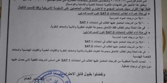الحد الأقص ى المطلوب من طلبة نوع واحد من الشهادات ولان طلبة الدبلومة هم الأكثر عددا.