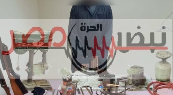 عقب تقنين الإجراءات أمكن إستهدافه وضبطه بمحل إقامته، وبحوزته (بندقية خرطوش – 2 طبنجة معدلة – فرد محلى الصنع – 2بندقية ضغط هواء – 2 سلاح أبيض – أجزاء وأدوات التصنيع – مبلغ مالى)،