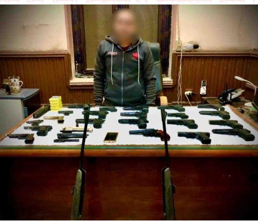 أمكن ضبطه ، وعُثر بحوزته على (9 طبنجات معدلة –12 طبنجة محدث صوت – 2 بندقية ضغط هواء – 200 طلقة صوت – صاعق – أدوات وأجزاء التصنيع ) ،