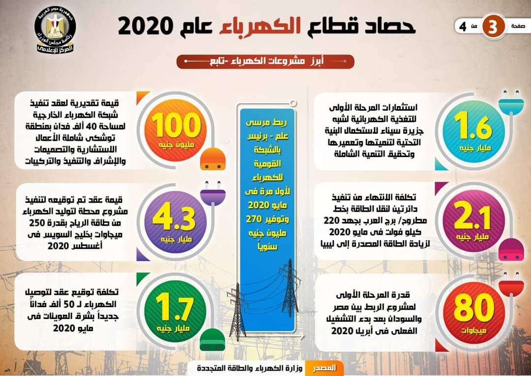وفي هذا الإطار حققت الوزارة خلال عام 2020 العديد من الإنجازات فى مختلف مجالات الكهرباء انتاجا ونقلا وتوزيعا مما ساهم فى ارتفاع ترتيب مصر فى مؤشر الحصول على الكهرباء الى المركز 77 من المركز 145 فى عام 2014 وذلك وفق تقرير ممارسة أنشطة العمل لعام 2020 .