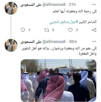 أعلن الكاتب والناقد علي المسعودي على حسابه الرسمي بموقع التواصل الاجتماعي تويتر أن الشاعر الكويتي جزاء الحربي توفي ظهر اليوم بعد صراع طويل مع المرض عن عمرٍ ناهز السبعين عامًا.