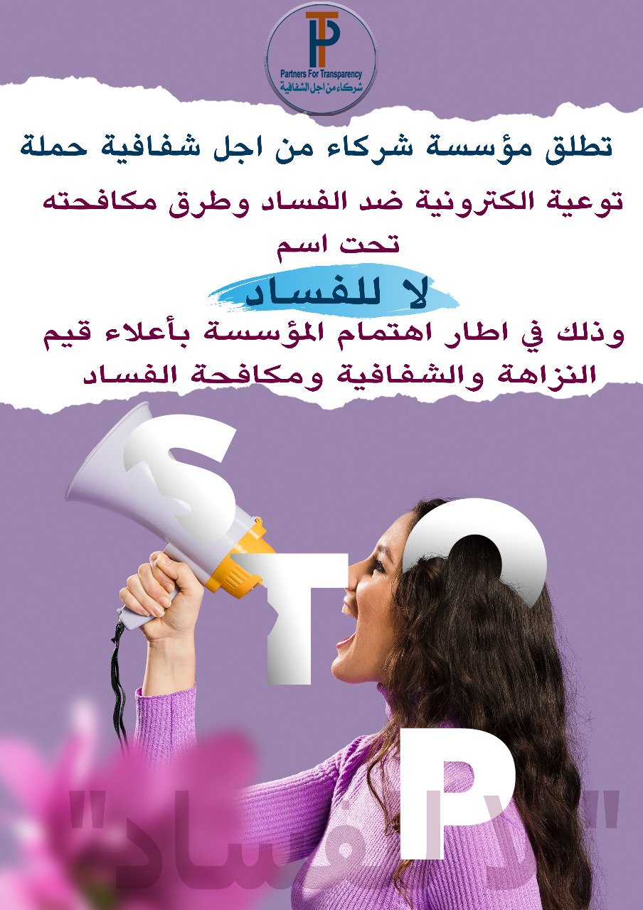 أعلنت مؤسسة شركاء من أجل الشفافية عن حملة إلكترونية لها ضد الفساد وطرق مكافحته تحت عنوان” لاللفساد”، وذلك في إطار اهتمام المؤسسة بدعم قيم النزاهة والشفافية ومكافحة الفساد، في الرابع والعشرين من مارس 2021.