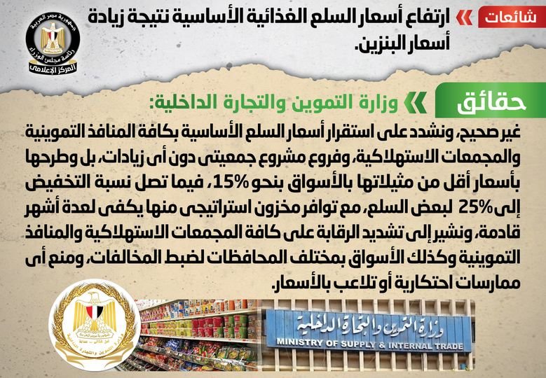 انتشر في بعض المواقع الإلكترونية وصفحات التواصل الاجتماعي أنباء بشأن ارتفاع أسعار السلع الغذائية الأساسية نتيجة زيادة أسعار البنزين، وقد قام المركز الإعلامي لمجلس الوزراء بالتواصل مع وزارة التموين والتجارة الداخلية، والتي نفت تلك الأنباء،