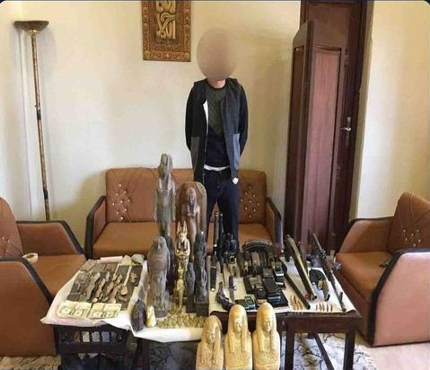 وبتطوير مناقشته وبتفتيش مسكنه تم ضبط (بندقية آلية – بندقية خرطوش- عدد من الطلقات مختلفة الأعيرة – 18 خزينة آلية – فرد محلى – كمية من مخدر الحشيش– كمية من مخدر البانجو – 15 تمثال حجرى مختلف الأحجام – 25 تمثال معدنى يشبه فى أثريتهم – 4 قطع سلاح أبيض “خنجر” – 2 ميزان حساس – عملات أجنبية – 9 هواتف محمولة – كاميرا – 2 كشاف – 2 حقيبة ذخيرة) ،