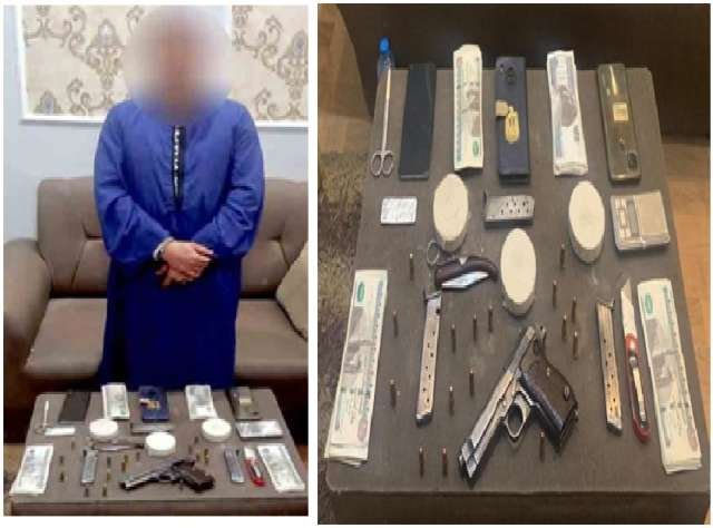 وضبط بحوزته (عدد 3 أسطوانات لمخدر الهيروين وزنت 500 جرام – عدد من الأقراص المخدرة– طبنجة – 3 خزينة – عدد من الطلقات النارية – مبلغ مالى – 3 هواتف محمولة – ميزان حساس – 2 سلاح أبيض) .