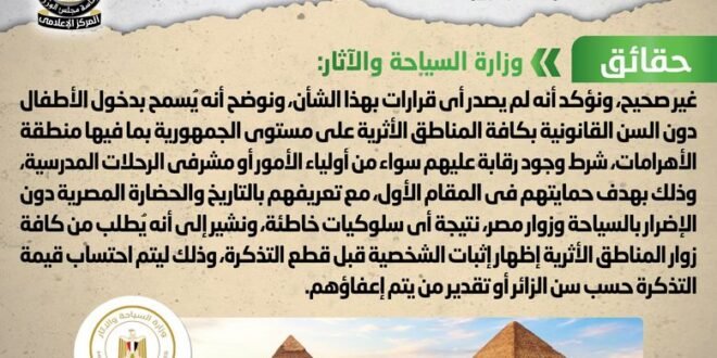 انتشر في بعض المواقع الإلكترونية وصفحات التواصل الاجتماعي أنباء بشأن صدور قرار بمنع دخول الأطفال دون السن القانوني نهائياً لمنطقة الأهرامات بالجيزة، وقد قام المركز الإعلامي لمجلس الوزراء بالتواصل مع وزارة السياحة والآثار، والتي نفت تلك الأنباء، مُؤكدةً أنه لا صحة لصدور قرار بمنع دخول الأطفال دون السن القانوني نهائياً لمنطقة الأهرامات بالجيزة، مؤكدةً أنه لم يصدر أي قرارات بهذا الشأن، مُوضحةً أنه يُسمح بدخول الأطفال دون السن القانونية بكافة المناطق الأثرية على مستوى الجمهورية بما فيها منطقة الأهرامات، شرط وجود رقابة عليهم سواء من أولياء الأمور أو مشرفي الرحلات المدرسية، وذلك بهدف حمايتهم في المقام الأول، مع تعريفهم بالتاريخ والحضارة المصرية دون الإضرار بالسياحة وزوار مصر، نتيجة أي سلوكيات خاطئة، مُشيرةً إلى أنه يُطلب من كافة زوار المناطق الأثرية إظهار إثبات الشخصية قبل قطع التذكرة، وذلك ليتم احتساب قيمة التذكرة حسب سن الزائر أو تقدير من يتم إعفاؤهم.