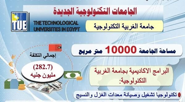 وأوضح المُتحدث الرسمي أن جامعة الغربية التكنولوجية ستُقدم برامج دراسية جديدة تخدم الصناعة بالمنطقة الجغرافية المحيطة بها، تشمل (تكنولوجيا تشغيل وصيانة معدات الغزل والنسيج – تكنولوجيا صناعة الغزل والنسيج – تكنولوجيا الصباغة وتجهيز المنسوجات – تكنولوجيا صناعة الملابس الجاهزة – تكنولوجيا الصناعات المعدنية – تكنولوجيا الصناعات الكيميائية – تكنولوجيا الصناعات الغذائية).