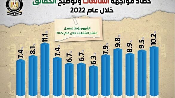 وفي هذا الصدد نشر المركز الإعلامي لمجلس الوزراء تقريراً تضمن إنفوجرافات تتناول حصاد مواجهة الشائعات وتوضيح الحقائق خلال عام 2022.