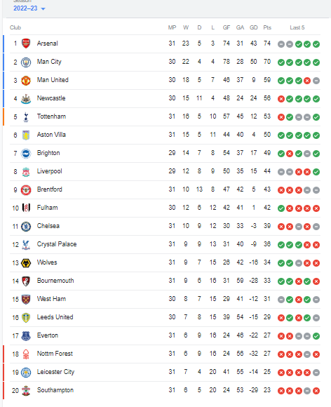 واصل أرسنال هيمنته على صدارة ترتيب الدوري الإنجليزي الممتاز بعد مباراة أمس الأحد بين مانشستر يونايتد ونوتنجهام فورست، حيث فاز الشياطين الحمر بهدفين دون رد، في المباراة التي جمعت بينهما على ملعب سيتي جراوند، ضمن الجولة 31 من بطولة الدوري الممتاز الموسم الحالي 2022-2023.