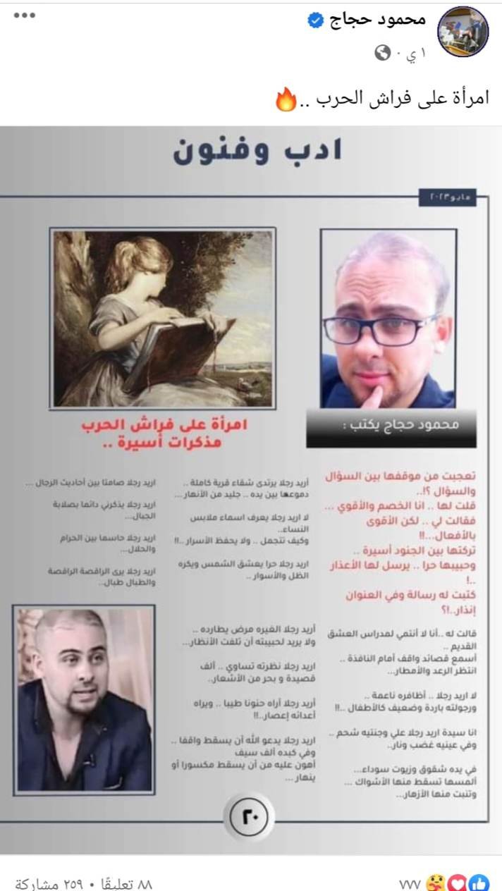 والشخصيات العامة والفنانين على صفحته الشخصية امرأة على من فراش الحرب ترويجاً لعمله القادم مذكرات أسيرة الجدير بالذكر جاري البحث حول تحويله لعمل فنى متكامل..