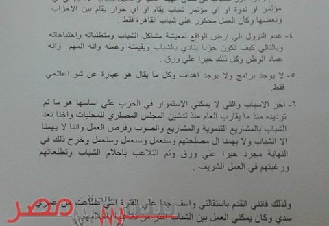 و عدم النزول الي ارض الواقع لمعيشة مشاكل الشباب ومتطلباته واحتياجاته وبالتالي كيف نكون حزبا ينادي بالشباب وبقيمته وعمله وانه المهم وانه عماد الوطن وكل ذلك حبرا علي ورق ، لا يوجد برامج ولا يوجد اهداف وكل ما يقال هو عبارة عن شو اعلامي فقط ، اخر الاسباب والتي لا يمكني الاستمرار في الحزب علي اساسها هو ما تم ترديده منذ ما يقارب العام منذ تدشين المجلس المصلري للمحليات واخنا نعد الشباب بالمشاريع التنموية والمشاريع والصوب وفرص العمل واننا لا يهمنا الا الشباب ولا يهمنا ال مصلحتهم وسنعمل وسنعمل وسنعمل وخرج ذلك في النهاية مجرد حبرا علي ورق وتم التلاعب باحلام الشباب وتطلعاتهم ورغبتهم في العمل الشريف .