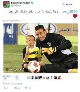 تمنى عصام الحضرى حارس مرمى وادى دجلة ومنتخب مصر، سرعة الشفاء للطفل عمر على، المريض بـ”السرطان”، عبر صفحته الشخصية على موقع التواصل الاجتماعى تويتر.
