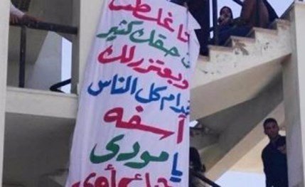 وقامت الطالبة بالفرقة الثالثة بكلية الآداب بالاعتذار لحبيبها مودى بالكتابة على اللافتة “أنا غلطت فى حقك كتير وبعتذرلك أمام كل الناس.. آسفة يا مودى بحبك أوى “.