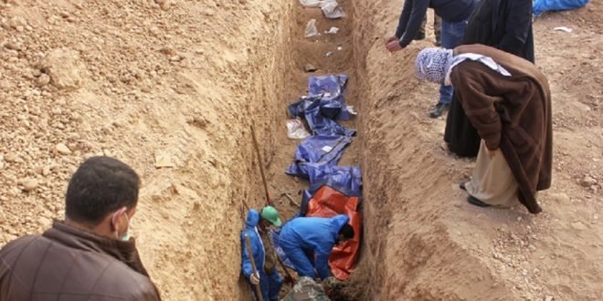 واوضح أن “المقبرة الاولى في الصقلاوية تشير الى ان عصابات داعش الإرهابية قامت بجلب مجموعة من الجثث تم قتلها مسبقا ومن ثم دفنها ضمن منطقة الازركية في شمال غرب الفلوجة”.