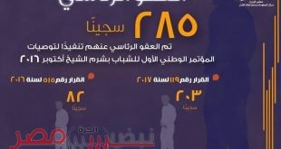 كتبت // سماح رضا أعلن مركز معلومات مجلس الوزراء أن 285 سجينا تم العفو الرئاسي عنهم تنفيذا لتوصيات المؤتمر الوطني الأول للشباب بشرم الشيخ أكتوبر 2016. وأوضح المركز في تقرير له مساء اليوم الاثنين أن القرار رقم 119 لسنة 2017 تضمن العفو عن 203 سجناء بالإضافة إلى القرار رقم …